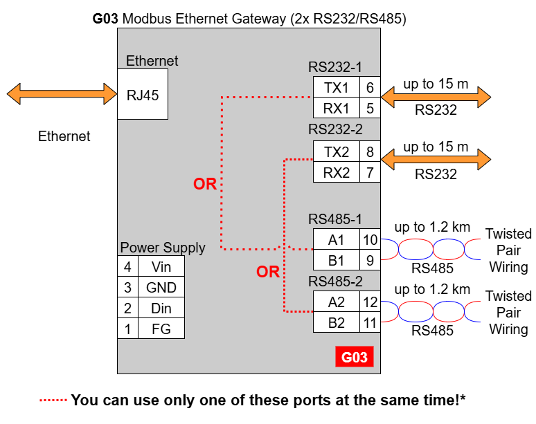 In the G03 gateway user should use only RS232 or only RS485 interface of one port as they occupy the same internal bus of the device. It means, don't use pairs: RS232-1 & RS485-1 at the same time and RS232-2 & RS485-2 at the same time!