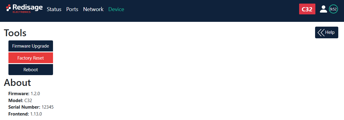 On the device page there are tools used to a firmware update, a factory reset and a device reboot.