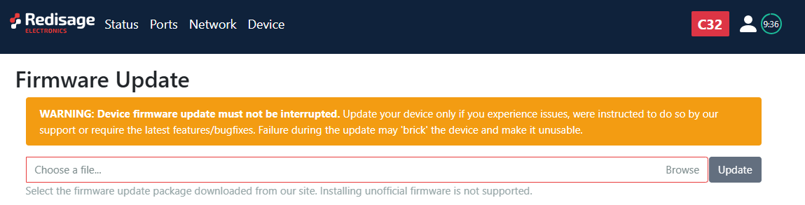 The device firmware update must not be interrupted. Update the device only if experiencing issues, being instructed to do so by our support or requiring the latest features/bugfixes. Failure during the update may 'brick' the device and make it unusable.