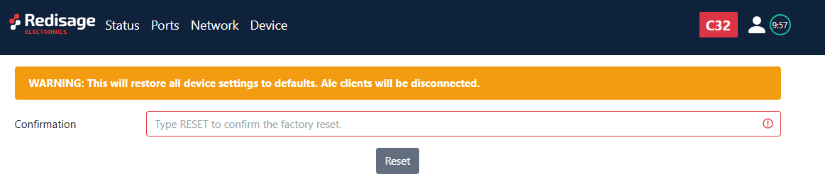 To restore default settings, press the “Factory Reset” button. After that, user will be asked to type “RESET”. Then it will take a few seconds to reload the web page and restart the device.