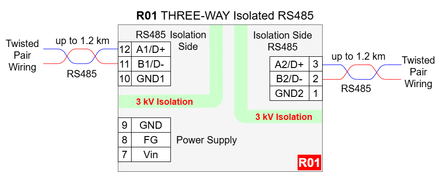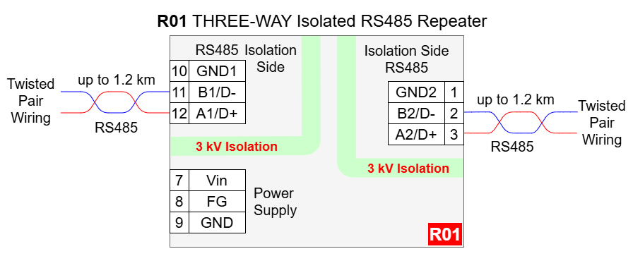 R01 - THREE-WAY Isolated RS485 Repeater