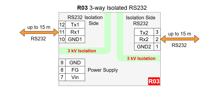 R03 - 3-way Isolated RS232 Separator Repeater