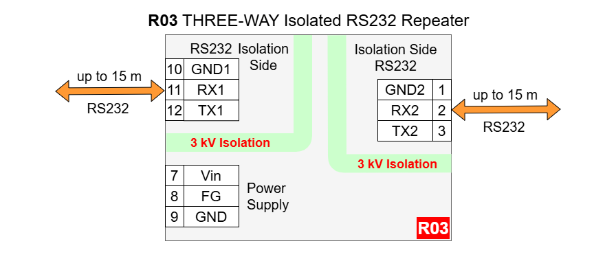 R03 - THREE-WAY Isolated RS232 Separator Repeater