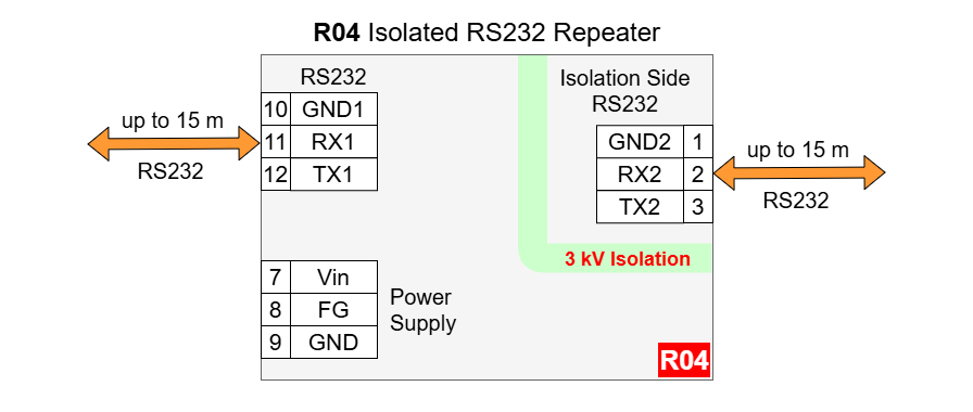 The R04 is exactly the same as the R03, except for the isolation range. The R04 has one RS232 side isolation.