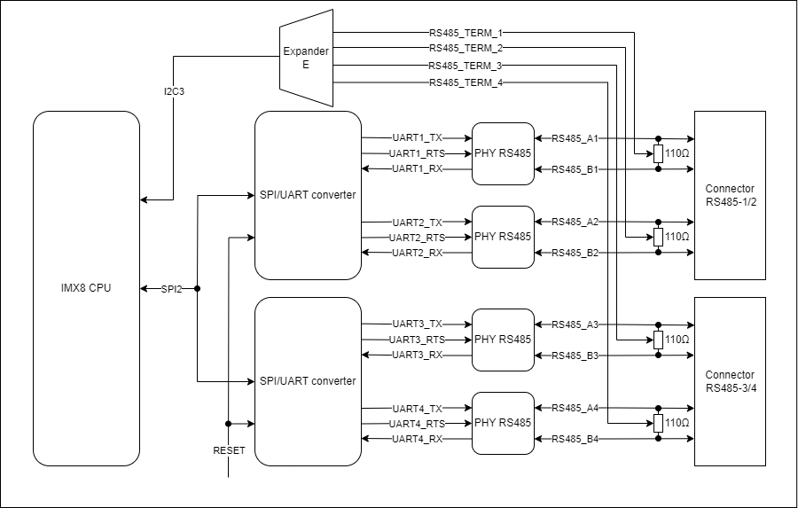 The termination resistors are controlled by signals output from the Expander E connected by the I2C3 interface with the CPU.