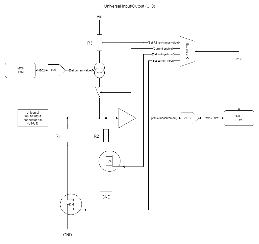 Switching to particular modes of the circuit is realized by “Set voltage input”, “Set current input”, “Current enable”, “Set R3 resistance value” and “Set current value” signals.