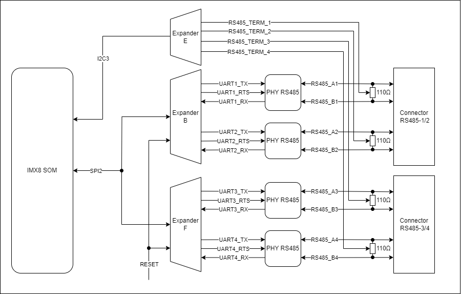The termination resistors are controlled by signals output from the Expander E connected by the I2C3 interface with the CPU.