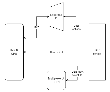 User-defined DIP switch options are connected to the expander D which is connected to the CPU via the I2C3 interface.
