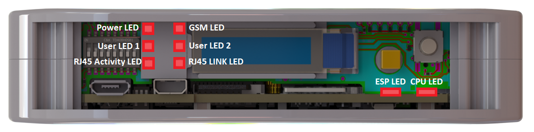The device is equipped with 8 LEDs. 2 of these LEDs are placed on the mainboard, while the other 6 are on the front panel of the HMI board.